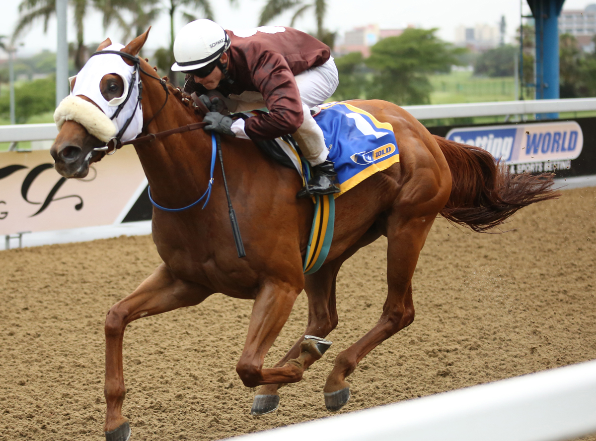 The switch from a soggy Scottsville to the Greyville poly yesterday was always on the cards according to the weather bureau and although the fields were thinned out by withdrawals and the need to trim to 12-horse fields, the poly held up well under persistent rain. But it was all sunshine for apprentice Denis Schwarz who booted home four winners that included all four legs of the jackpot.