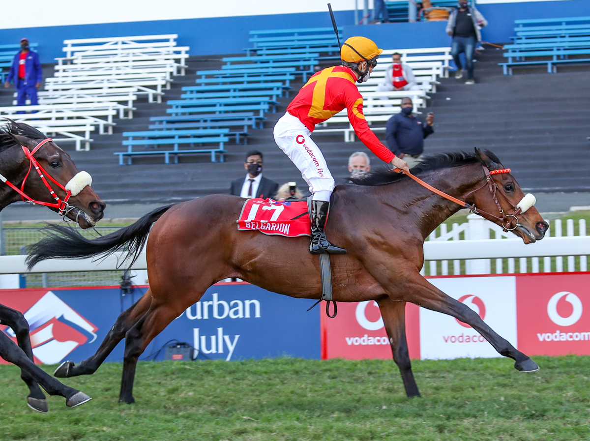 Justin Snaith landed his fifth Vodacom Durban July and Richard Fourie his third at Hollywoodbets Greyville today as Belgarion fended off the country’s top three-year-old Got The Greenlight to win in the fastest time since the track was narrowed in 2014.
